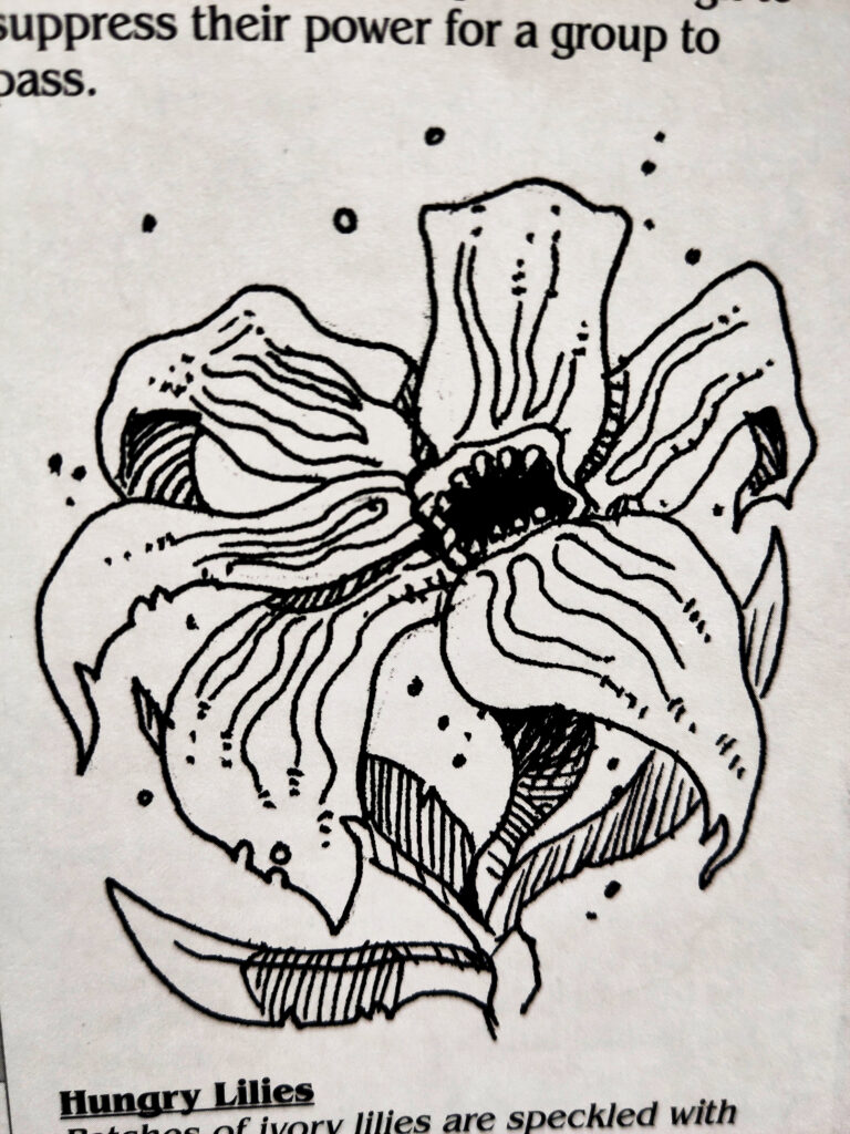 In our last session, my players have encountered a field of Hungry Lilies: flowers with tiny mouths full of teeth that attack anyone who enters their vicinity. They’ve spent a phase of the day to burn them all down.